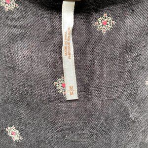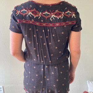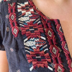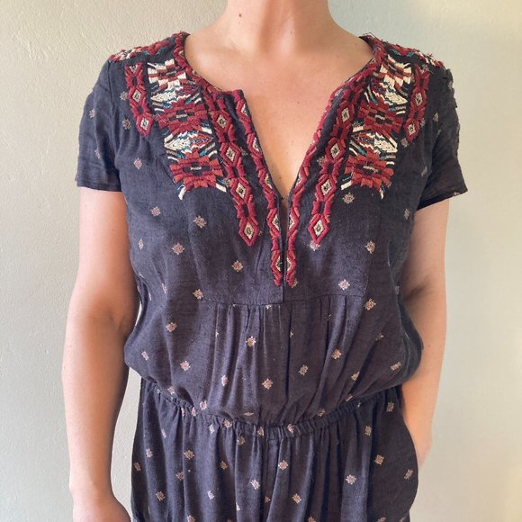 Styled with intricate embroidery and short sleeves, this breezy romper flaunts a boho-chic style. The fabric tag has been removed, but it is a cotton blend with a linen texture and feel. Embroider is mauve, red, teal, gold, and cream.