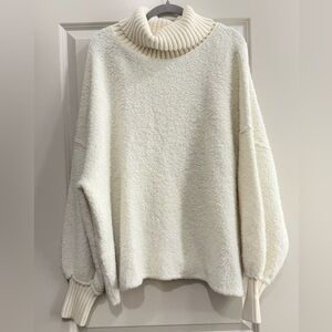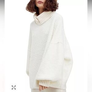 Stay cozy and chic with this Free People sweater, featuring a luxurious cowl neck and a ribbed knit texture. Its oversized fit in a pure white hue offers both comfort and versatility, making it an essential piece for any wardrobe.
