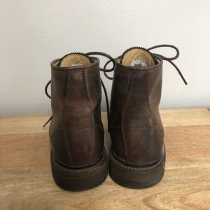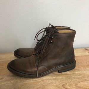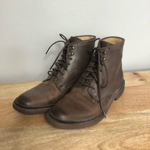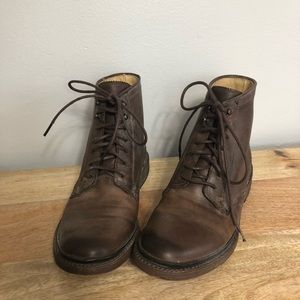 These are a beautiful pair of Frye James Lug Lace Up Boots. Rustic leather. Barley worn. NWOT! Size 6 Women’s. Dark Brown