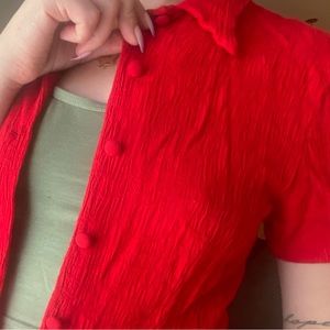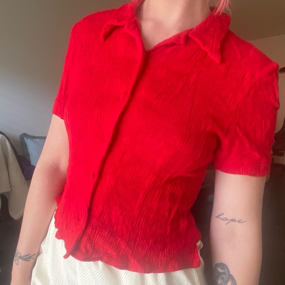 Super cute collared button up with an open back. I really love this shirt and am sad to see it go, but I just never wear it anymore. It’s a beautiful red and is fairly light-weight. Brand is Karin Stevens Petites and I would guess it’s on the vintage side. Fits like a small.