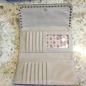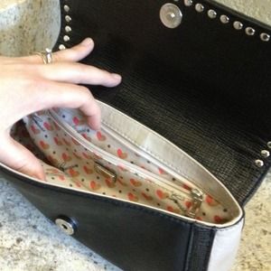 Clutch purse is NWOT. I only used the wallet, which still looks new with the exception of a small pen mark on the interior corner. Clutch is black with cream color at each end.