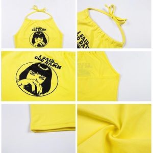 Bow down to the queen of 90s anarchy in this yellow crop tie halter with Mia Wallace graphic and “I said goddamn” lettering!