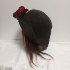 ***SOLD*** Gray Felted Wool Derby Hat with Burgundy Red Silk Flower