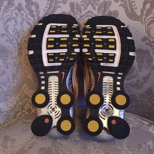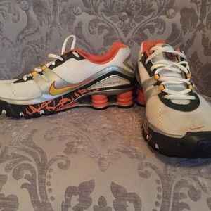 Great condition Men's Nike shox in multi color. Limited edition. Super stylish. White, Army green, silver, orange and yellow. Graffiti design.