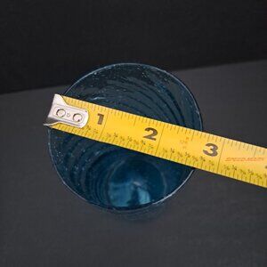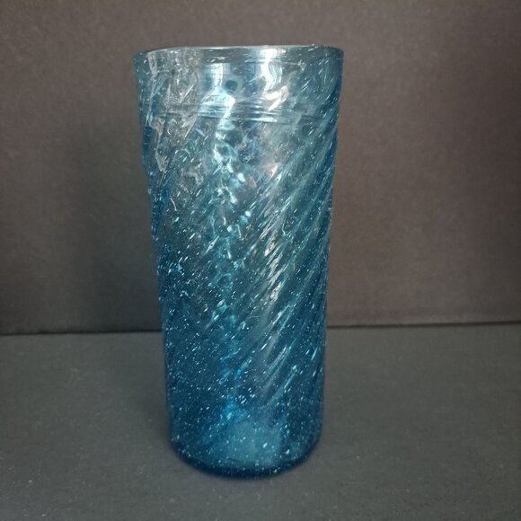 This stunning hand-blown blue glass tumbler features a swirl optic design with controlled air bubbles throughout, giving it a rich, textured look and artisanal character. The vibrant blue tone and organic imperfections highlight its handmade nature—perfect for collectors or those who enjoy unique glassware.