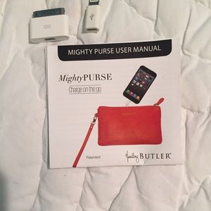 Tan, leather little mighty clutch purse. Charge your phone on the go! Comes with multiple adapters for IPhones, IPads, or IPods. Only used a couple of times, so quality is almost new.