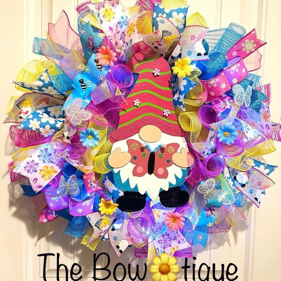 About 22 inches, 6 inch-deep door or mantle wreath. Pink, blue & yellow mesh back. Daisies, butterflies and gnome themed w/ vibrant colored wired ribbons (9 styles). A hand painted wooden butterfly holding gnome sign affixed to the wreath. Has bright daisies and embroidered butterflies attached.