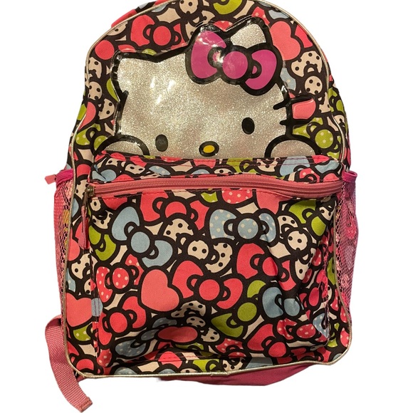 in good condition, has small stains on the back of it and one on one of the straps. you can see both of them in the last picture. super cute though the rest of it is in great condition. has two pockets on the sides to put drinks in. one big picket in the front. no pockets on the inside.