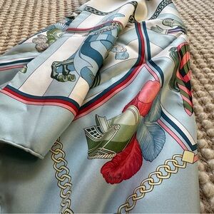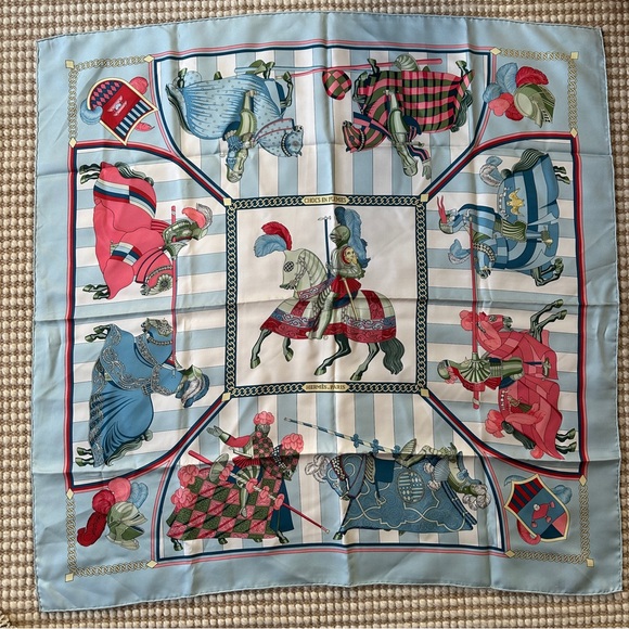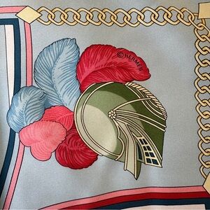 The Hermès “Chocs en Plumes” 90cm scarf, designed by Christiane Vauzelles, was first issued in 1993. This 100% silk twill scarf features vibrant designs of plumes, feathers, and gold chains. It’s a highly sought-after vintage collectors item.