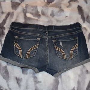 Hollister brand jeans shorts. Size 1 or 25 waist. In great condition! I would consider these shorts to be a medium to dark wash denim.