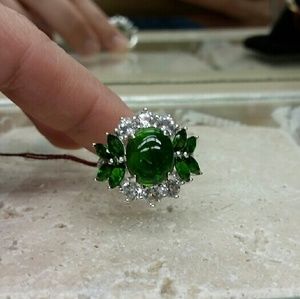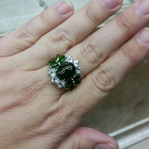 I can't even describe how stunning this ring is. The centerpoint is a super large, clear and vibrant green chrome diopside cabochon with beautiful crystalline natural inclusions. A diopside over a carat or two is a rare thing and this one is several carats. It is surrounded by marquis diposides and brilliant white topazes. Set in 925 sterling and covered in platinum. This is one you'll want to pass down.