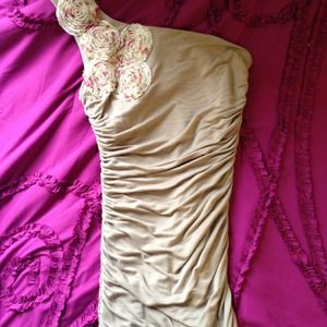 A pretty evening or girl's night out dress! Is made of stretchy material and has a nice design on the shoulder. Fits a medium or a small.