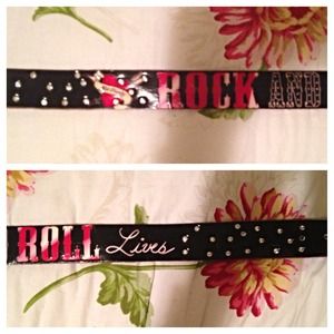 Authentic. "ROCK AND ROLL LIVES" Belt buckle has rhinestones as well as the actual belt. 42" from buckle to end of belt. 1 1/2" width. Buckle is 2 1/4" by 2 3/4". Not missing any jewels. Genuine handmade leather. Size medium. Buckle is removable by snap on feature. Small scuff on end of belt; other than that it's in great shape.