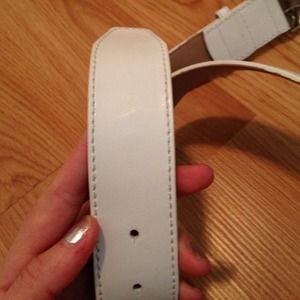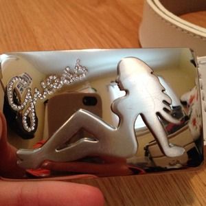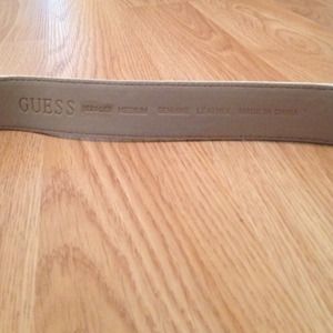 White genuine leather belt with square metal buckle. Buckle has model on it with Guess in rhinestones. In great condition.