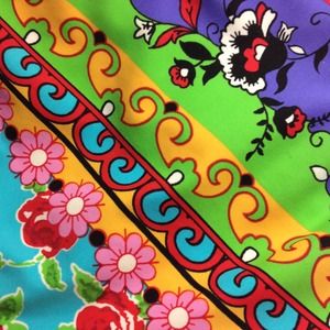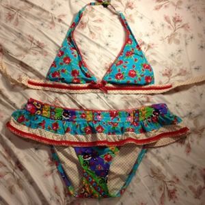 Gorgeous floral bohemian Betsey Johnson bikini! Bow on front center bust and on the back of the skirted hipster bottoms. Beautiful popping colorful print! Brand new, never worn accept in these modeled pictures. Top is a Xsmall, Bottom is a Medium.