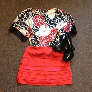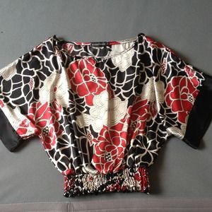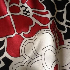 This beautiful silk Rampage top has brilliant red, white, and black floral design. Very fun and unique.