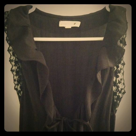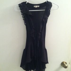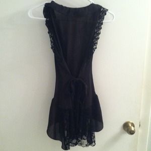 This piece is very unique. You can wear anything underneath to accent this black lacey cover up. There's lace on the sleeves and the bottom trim. Ties in the front and back to accent any size curves.