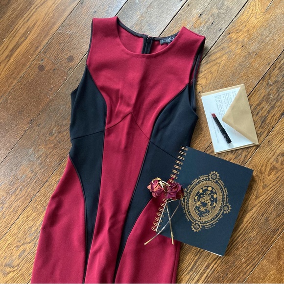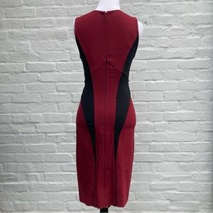 Major femme fatale vibes with this gorgeous sleeveless, knee-length sheath dress. Features a jewel neckline and flattering black colorblocking. Very good condition; purchased from Macy’s in early 2010s but only worn a few times. Size petite small. Back zip closure. Viscose, nylon and spandex. By Intermix.