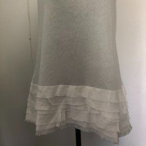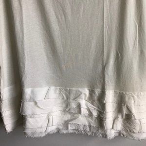 details/description: light weight, T-shirt knit with gauzy bias trim at neck and armholes...detailed with a peplum-like flouncy 7 layers along the bottom/hem.