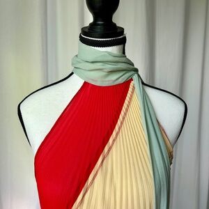 This ethereal halter gown is made from pleated silk chiffon, featuring an asymmetrical handkerchief hem that moves with effortless grace. The nature-inspired print blends wing-like forms and organic motifs with bold color blocking — a stunning expression of Gaultier’s French design genius.