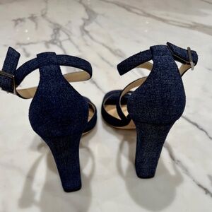 ** SOLD **. Jimmy Choo Denim Peep Toe, Strap Sandals.