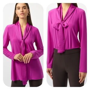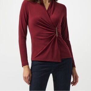 This sophisticated Joseph Ribkoff top features a slightly ruched front and asymmetric hem for a flattering fit. In addition, this top features a rounded neck and long fitted sleeves. The fabrication is a silky knit of 96% Polyester and 4% Spandex. Approximate measurement shoulder to hemline 26"; bust 18"; sleeves 25". Hand or machine wash cold water, hang to dry, do not dry clean
