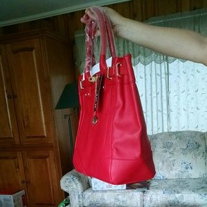 This bag exudes sophistication and we love how the small chain detail really adds a tiny element of edge to the look. Clean front with detailed stitching around the exterior. Dual top straps with gold hardware buckling.