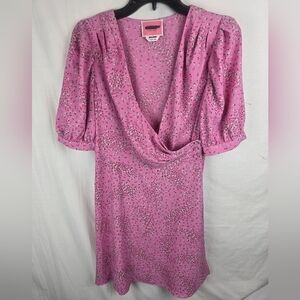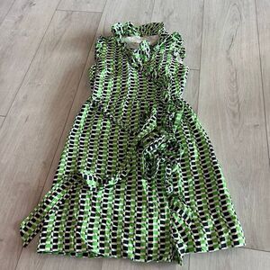 Worn to one even about 3 years ago, in the back of the closet ever since. Silk blend, gold zipper at back, knee-length and ruffle accent at scoop-neck. Bust is 34", waist is 28", hip is 34" and length is 38". No rips, stains or tears.