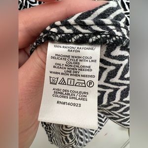 If you like receiving compliments, this is the top for you! I always received many every time I wore it! Very cute black and white chevron print shell with ruffle detail around the neck and a tie. Goes great with bright, bold colored trousers.