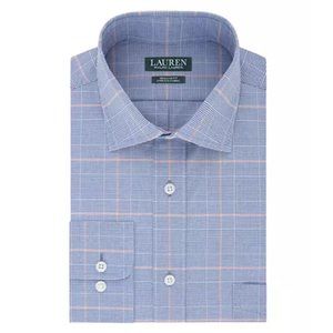 This men's Lauren Ralph Lauren UltraFlex Regular Fit dress shirt is size 16 x 32/33 and NWT! The 96% cotton and 4% spandex stretchable, moisture wicking, non-iron fabric is a blue check pattern with pink highlights. This long sleeve dress shirt features a spread collar, a button front, a chest pocket, and 1-button adjustable barrel cuffs.