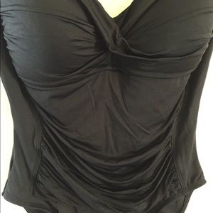One piece, twist front ruched for flattering effect, tummy control design, moderate bottom coverage.