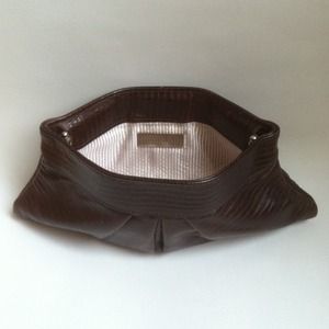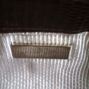 Classic dark brown lizard texture clutch in perfect condition. Standard Lauren Merkin snap hinge closure. Cute interior satiny striped lining.