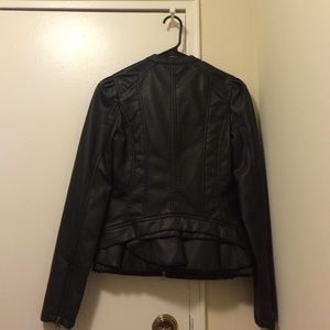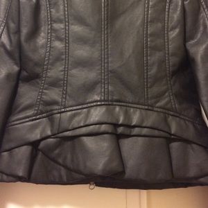 "pleather coat" 100% polyester. Worn maybe twice. Like new condition. Size xs