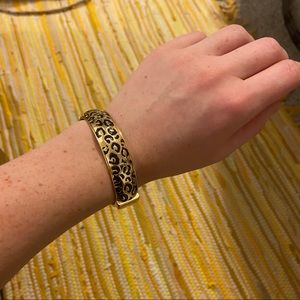 NWT (although price is ripped off bc it was given as a gift). Never worn! Gold with black leopard print. Hinges open with magnetic clasp. 2.5” diameter.