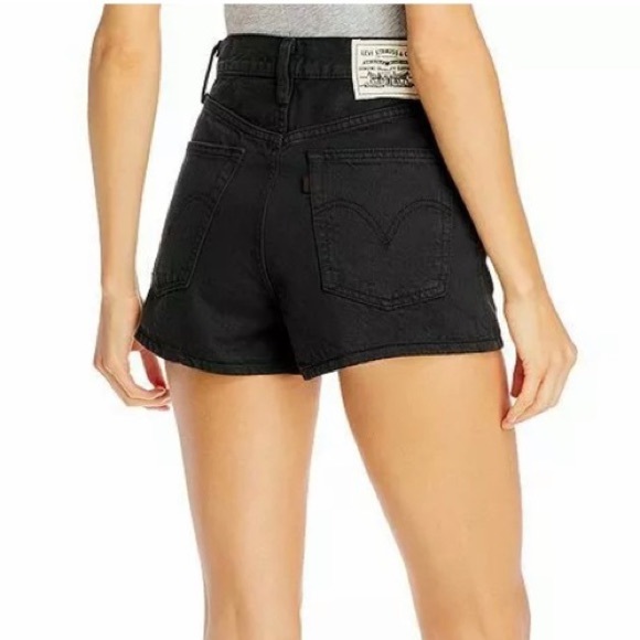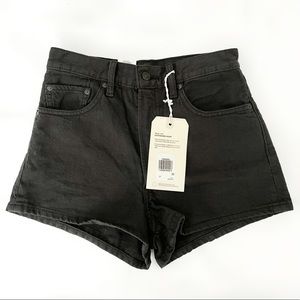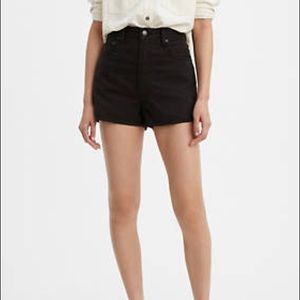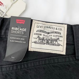 Levi’s WellThread rib cage shorts in black, size 27. Brand new with tags and never worn! Features a zip-fly with button closure. Super high-rise. Unique white WellThread patch in the back. Originally $98 MSRP.