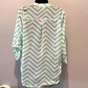1/4 Long Sleeve White/Aqua Chevron pattern chiffon-like material top. Genlty Used
