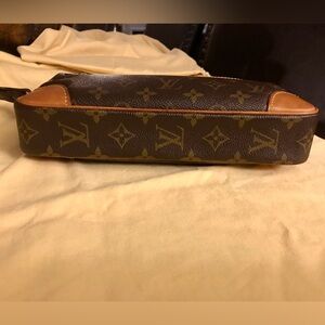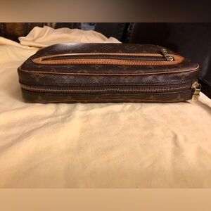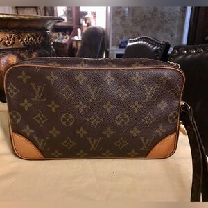 Louis Vuitton Marly Dragonne GM . Monogram Canvas Clutch Purse Organizer Wristlet. In good condition. Minimum wear on all hardware, will need cleaning. Canvas and leather in good condition. Leather is a light honey color with water spots, but there is a crack in leather on side leather band. Inside and outside pocket has been cleaned by previous owner. Inside leather has a few tiny pin size ink marks. All zippers zip and unzip with no issues. Preowned odor and odor from cleaning solution used to remove the peeling and stickiness. Cleaning solution smell is there. If you are sensitive to smells, this is NOT the clutch for you. Overall, Clutch is in good condition for her age! Beautiful!
