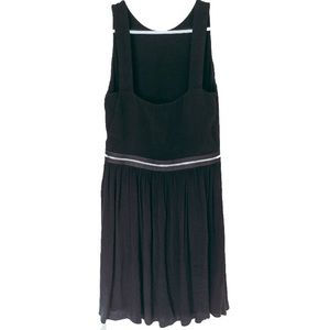 High neck, low back, fitted to waist with (closed, nonfunctional) zipper waistband detail then semi sheer panels float to above the knee. Very light-weight, totally opaque, appropriate for office attire and nights out. Perfect, like-new condition.