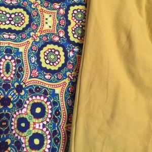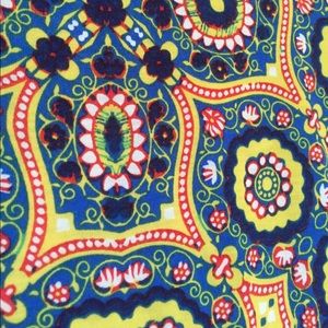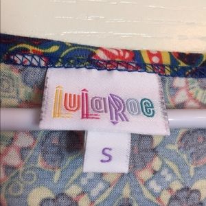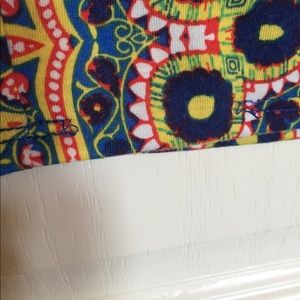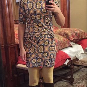 LuLaRoe Julia dress size S. Colors are: yellow, blue, dark blue, red, and white. (See pictures) Goes great with mustard yellow leggings or navy blue (leggings not included). Hem is starting unravel on bottom right side. My sewing machine is broke or I would fix it. :-( Not noticeable though. Beautiful fun dress. Only worn a couple of times.
