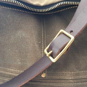Hand-made, California brand/designer. Real leather, reinforced canvas, gold-colored hardware & buckles. Two outer pockets and two inner pockets. Brand new, less than one year old.