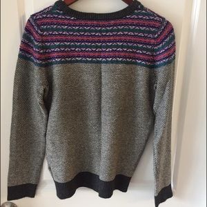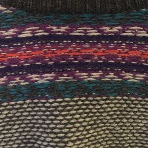 Wallace by Madewell sweater. The bottom is a charcoal grey and cream woven pattern and the top is a reverse fair isle pattern in shades of purple, teal, and orange.