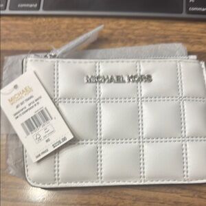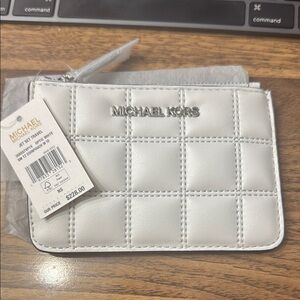Elegant quilted pouch by Michael Kors. Features a white design with silver logo detailing.