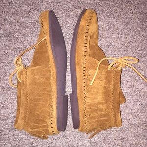 Minnetonka fringe lace up leather booties women's size 6 NWOT NWOB **NO TAGS but have never been worn** Has a "foam like" bottom sole. Brand new, no flaws! Only selling because there too small for me unfortunately. FEEL FREE TO ASK QUESTIONS! ***FAST SHIPPING*** •••••WILLING TO TRADE FOR PATAGONIA OR NORTH FACE KIDS JACKET!!!!!••••••
