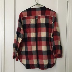 A feminine variety of a typical flannel shirt. Fit is a bit loose and boxy with 3/4 length sleeves. In great condition!