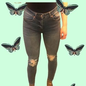 Very cute high rise Monkey Ride jeans. Medium wash with intentional holes and distress at the knee. Perfect for that 90s or vintage look.