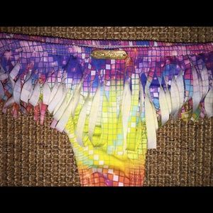 Playful tiny Brazilian bikini bottoms by San Lorenzo. Rainbow Multicolor with fringe, super small and super fun! Good condition.