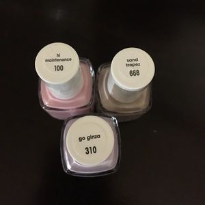 Brand new essie nail polish bottles. Never opened + never used (not even to try out the color). Colors in this bundle are in "Hi Maintenance", "Go Ginza" and "Sand Tropez"