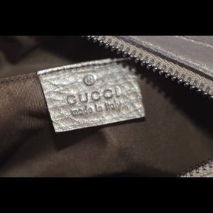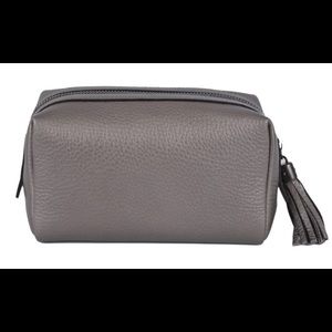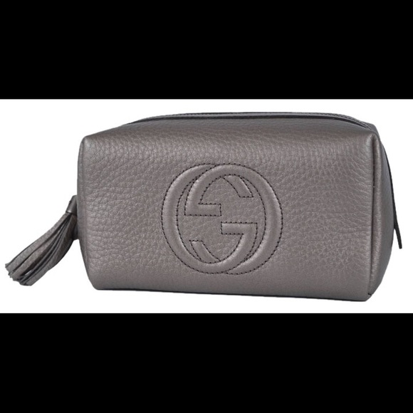 Gorgeous GUCCI textured silver grey leather travel GG cosmetic makeup bag or clutch.. Top zip close with leather tassel pull. Interlocking GG logo. Interior slip pockets. Measures 6.5" x 3.75" x 2.75". Made in Italy. Comes with Gucci dust bag. Included: cosmetic bag, dust bag, controlling are and tags. No trades. Additional pictures of serial # etc in another post in my closet. Check it out!