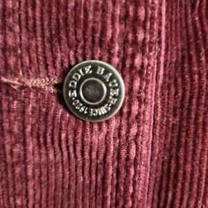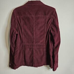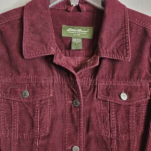 This Eddie Bauer Women's Corduroy Jacket in size L is a stylish and versatile choice for the colder seasons. Made from 100% cotton corduroy, it features a classic burgundy red color with buttons and pockets for added convenience. The jacket is designed for travel, casual wear, and work, making it suitable for a variety of occasions. With a banded back, collared neckline, and long sleeves, this basic jacket offers both comfort and style. Machine washable and with a regular fit, this Eddie Bauer jacket is a timeless addition to any woman's wardrobe. Like new condition.
