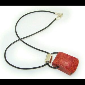 N0965-Retired handcrafted orange red sponge Coral nugget is suspended and centered on a black leather cord and finished in shiny sterling silver. The arrowhead logo and .925 are stamped into the hanging logo tag near the clasp. This piece has never been worn. ALL PRICES ON SILVER ARE FIRM. YOU CAN STILL MAKE AN OFFER THOUGH ?? TRADE VALUE $42!!!